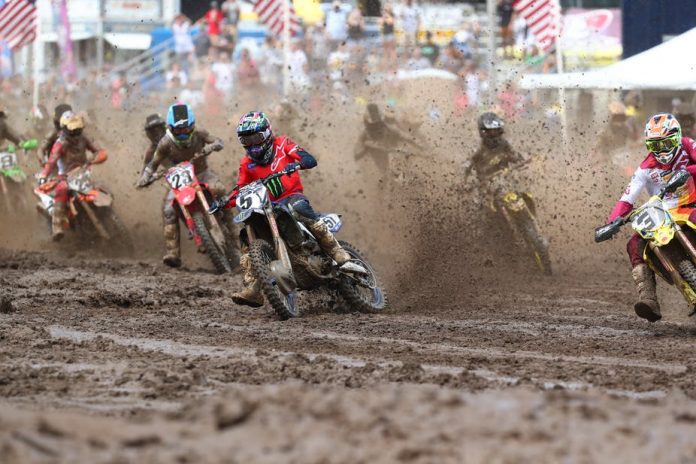 Aconteceu hoje a segunda etapa do AMA Motocross, transmitida ao vivo na parceria do site Show Radical junto da Motocross Racing TV, mais uma vez na pista do rancho Loretta Lynn’s no Tennessee. O tempo chuvoso deixou a pista pesada. Depois da vitória de Justin Barcia da Yamaha na primeira bateria, na segunda prova da 450cc, Max Anstie da Suzuki começou liderando no início da corrida, seguido por Marvin Musquin da KTM, Adam Cianciarulo da Kawasaki, Zach Osborne da Husqvarna e Barcia, que acabou caindo perdendo várias posições, enquanto Eli Tomac da Kawasaki ficou preso na lama com sua moto.