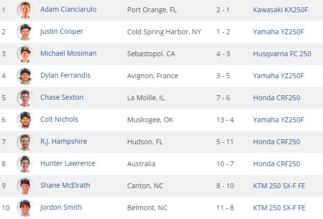 Na 250, a briga segue entre Adam Cianciarulo e Justin Cooper, Cooper fez (1-2), enquanto Cianciarulo fez (2-1) e garantiu a vitória na classificação geral, ambos com a mesma pontuação, porém Cianciarulo saiu como vitorioso da etapa após a conquista da segunda bateria.