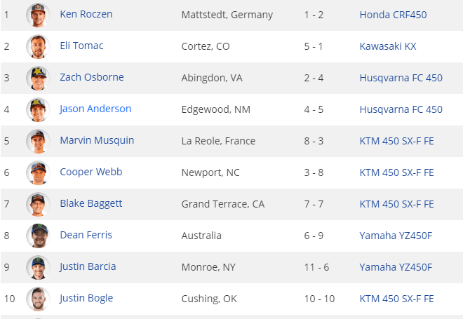 Zach Osborne, novato na principal categoria após um (2-4) conquistou o top 3 na classificação geral. Jason Anderson e Marvin Musquin fecharam os cinco primeiros na classificação geral da principal categoria.