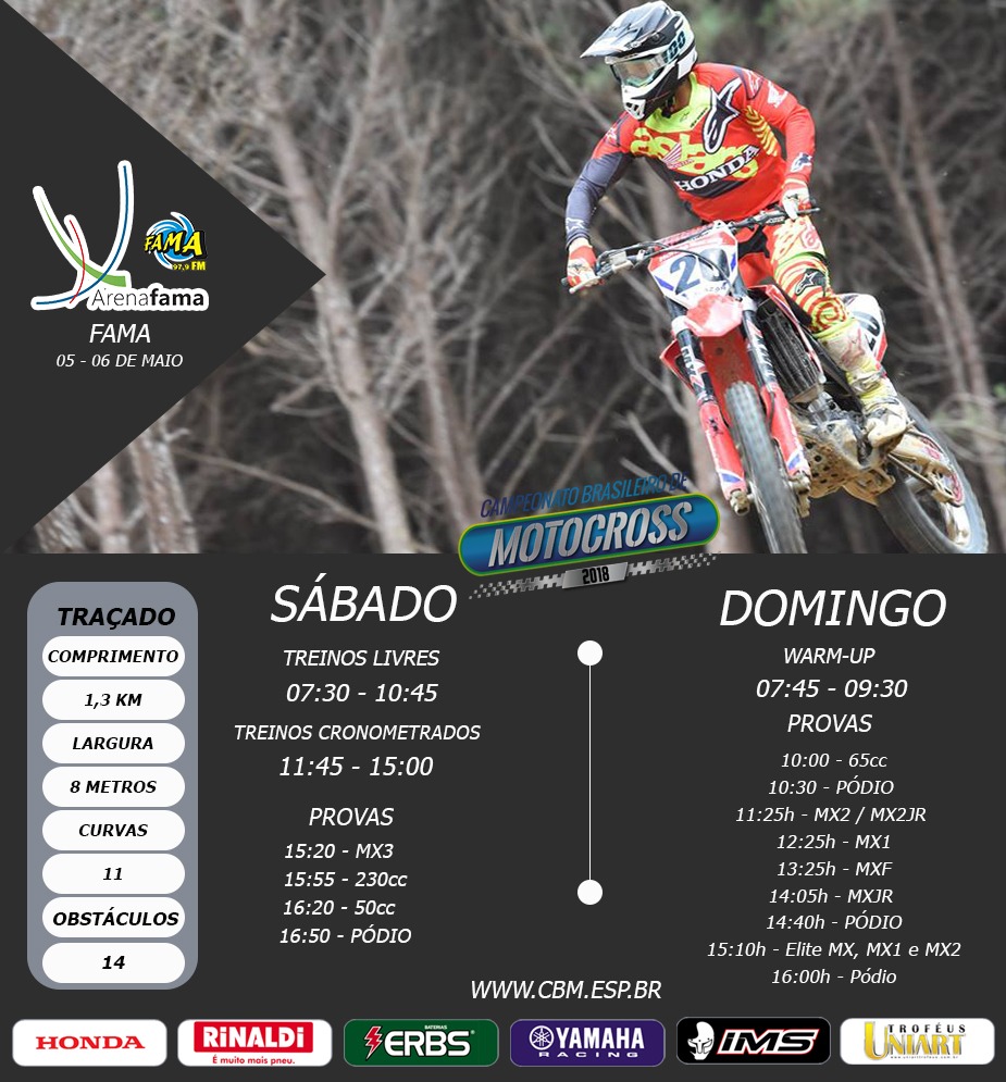 Os pilotos podem se inscrever, no máximo, até sexta-feira (04). Mas até quarta-feira (02 de maio) os interessados poderiam se inscrever antecipadamente para as categorias 50cc, 65cc, MXF, MXJR ao valor de R$100,00 – para as demais categorias o valor é de R$ 200,00. O prazo final de inscrição será na sexta-feira, no local, até as 18:30h na secretaria de prova, sem desconto (com valores que variam de R$ 150,00 a R$ 300,00). Clique e confira os detalhes para as inscrições dos pilotos.