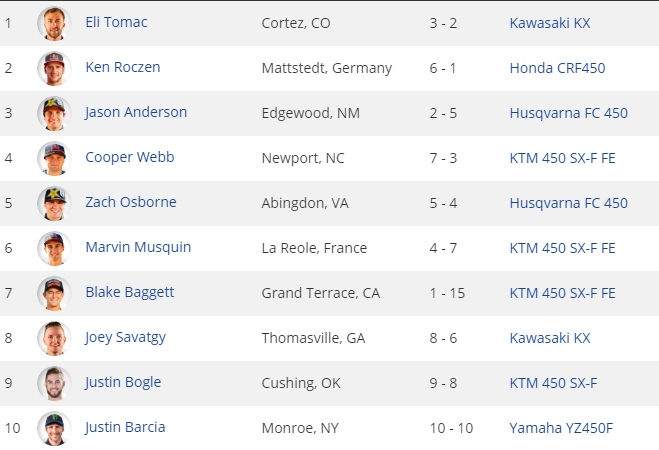 Ken Roczen após uma primeira bateria ruim, chegando apenas na sexta colocação, entrou com tudo na segunda corrida do dia e venceu a segunda bateria, na soma das duas corridas, Roczen fechou na segunda colocação, Jason Anderson, Cooper Webb, e Zach Osborne fecharam os cinco primeiros colocados na geral da 450.
