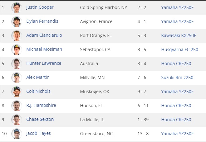 O atual líder da temporada, Adam Cianciarulo conquistou a terceira colocação, Michael Mosiman, e Hunter Lawrence fecharam o top 5 da 250.