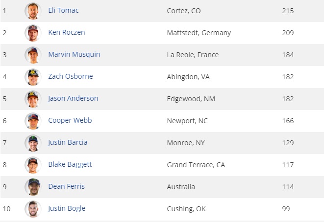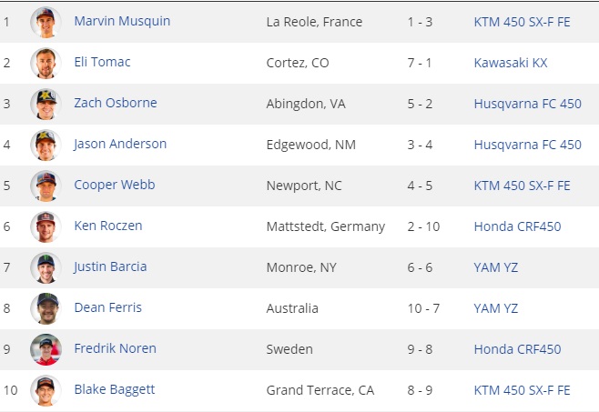 Tomac por sua vez, conquistou apenas a 7ª colocação na 1ª bateria, na 2ª bateria, Tomac venceu, garantindo assim a 2ª colocação na geral, e abrindo vantagem na liderança do campeonato.
