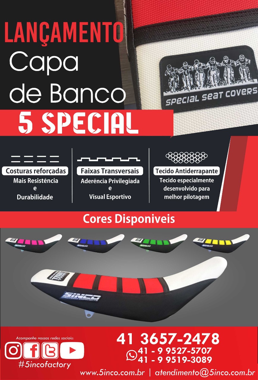 A 5inco Factory Concepts parceira e anunciante do site Show Radical apresenta a você nosso internauta o seu último lançamento em capa de banco off – road, confira a seguira a 5 Special uma capa desenvolvida visando performance, qualidade, durabilidade e aquele “up” no visual da sua moto.