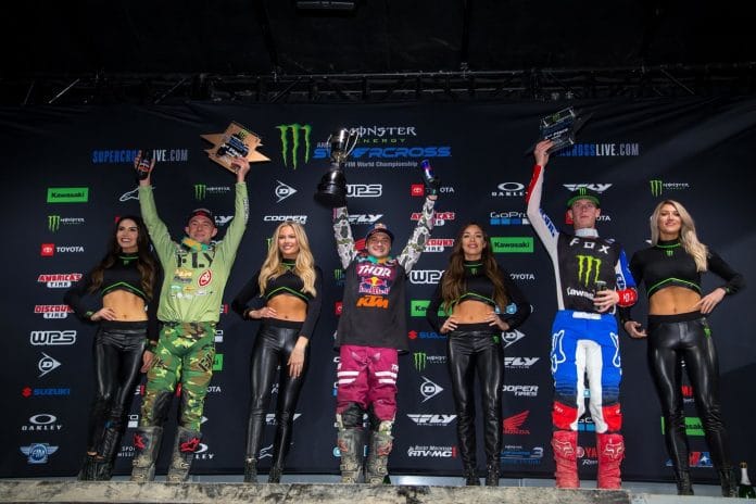 A noite de ontem foi bastante quente e disputada em ambas as categorias, na 450cc vimos Adam Cianciarulo liderar toda a prova até ser superado por Cooper Webb nas últimas voltas, garantindo assim a primeira vitória do atual campeão das 450cc, Cianciarulo foi o segundo e Blake Bagget o terceiro. Eli Tomac e Ken Roczen largaram muito mal e fizeram prova de recuperação, Tomac ficou em 4º e Roczen em 6º entre ele ficou Justin Barcia na 5ª colocação, assista ao vídeo.