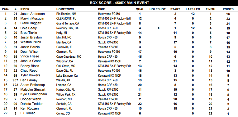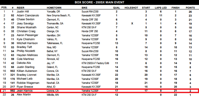 Na 250cc quem levou a melhor finalmente foi Justin Hill o atual número 1 ainda não havia vencido e conseguiu garantir a vitória numa noite que não foi satisfatória para Aaron Plessinger. Quem também não teve o melhor dos seus resultados foi nosso Brasileiro, Jean Ramos #992 que sofreu uma forte queda nos treinos e no main event caiu de novo por falta de confiança, mas o piloto encerra a primeira parte das suas corridas internacionais com saldo super positivo e muito realizado. O resultado final da 250 ficou: Justin Hill em primeiro, Adam Cianciarulo em segundo e Chase Sexton em terceiro.