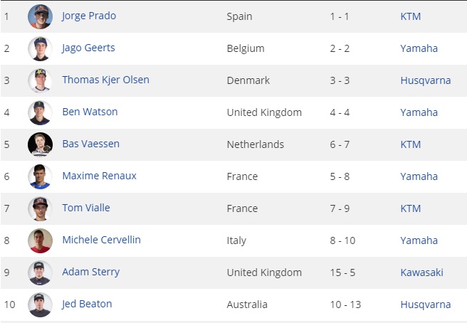 Na MX2 Jorge Prado da Red Bull KTM, venceu mais na temporada, e segue firme na busca por mais um título. Jago Geerts, Thomas Olsen, Ben Watson e Bas Vaessen fecharam os cinco primeiros da MX2.
