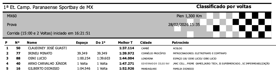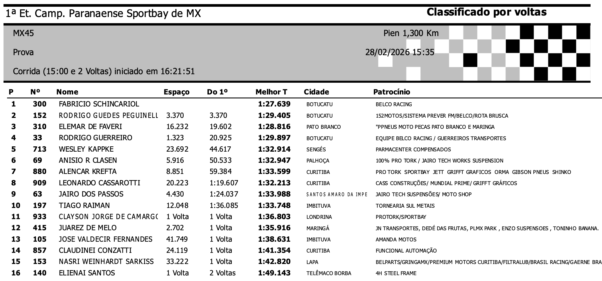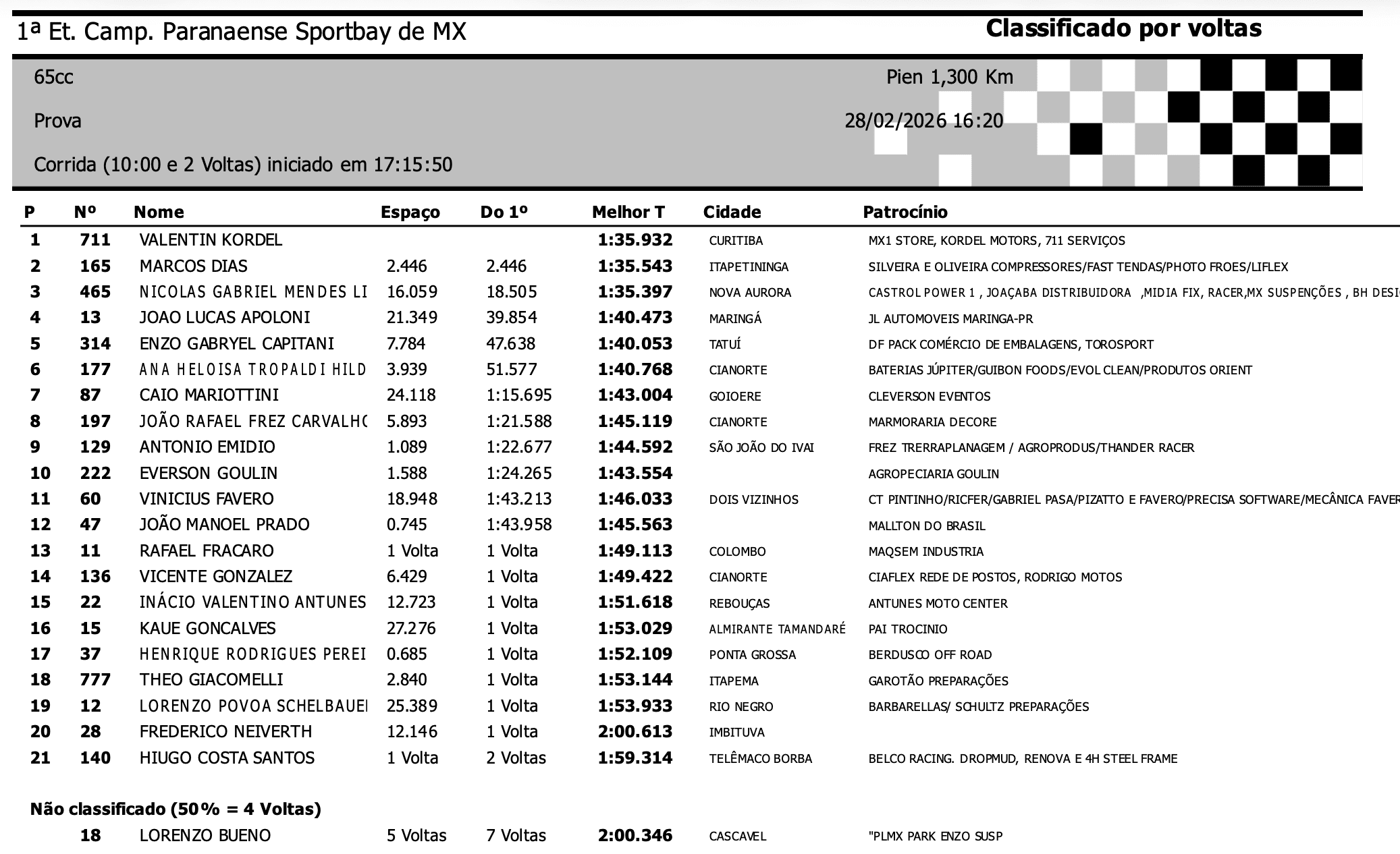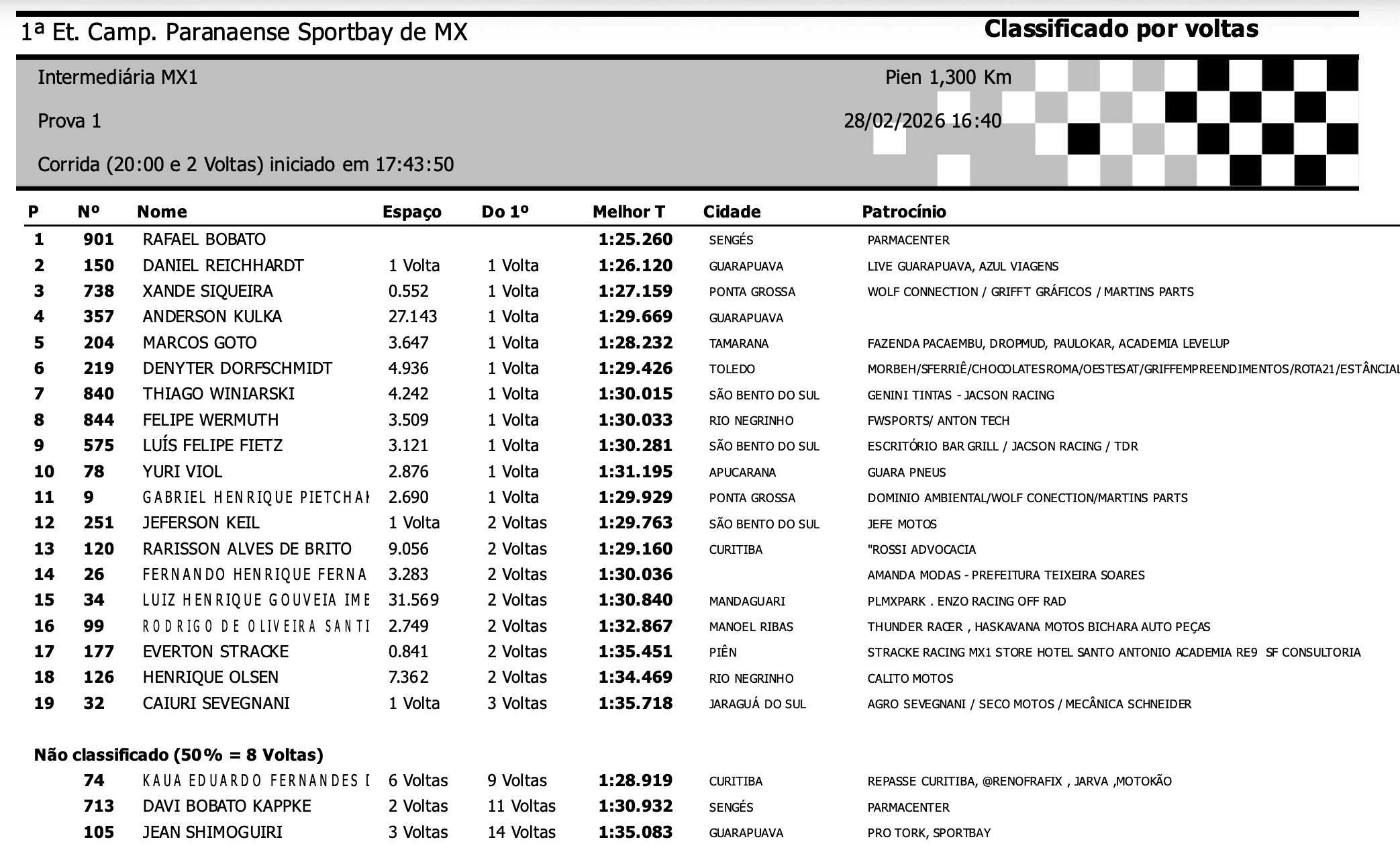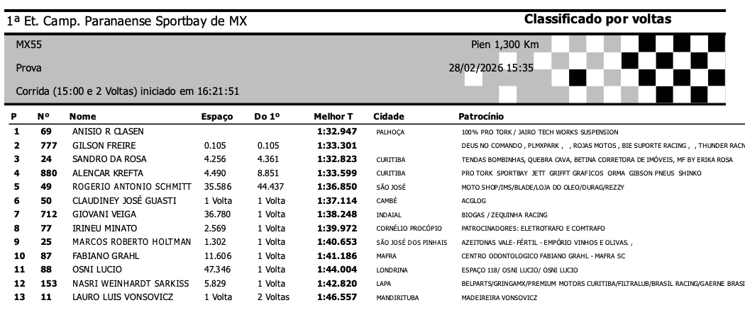 Os treinos movimentaram o sábado e, a partir das 15h, começaram as primeiras corridas da temporada, trazendo disputas emocionantes e muita adrenalina. Na categoria Estreante, Benicio Cassarotti levou a vitória. Já na bateria única que reuniu MX45, MX55 e MX60, o destaque foi Fabricio Shincariol, vencedor da prova geral e da MX45. Anísio Clasen conquistou a MX55 após uma intensa disputa, enquanto Claudiney Guasti venceu na MX60.