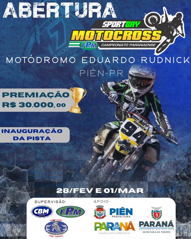 A abertura do Campeonato Paranaense de Motocross acontece neste fim de semana em Piên/PR, com o apoio da Prefeitura Municipal de Piên, da Secretaria de Turismo do Estado do Paraná e do Governo do Estado do Paraná. O evento marca a inauguração da nova pista de motocross do Motódromo Eduardo Leopoldo Rudnick.