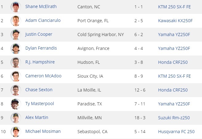 A 250 teve um novo vencedor e a decisão do título ficou para a última etapa. Shane McElrath, da TLD/Red Bull KTM, surpreendeu a todos e venceu as duas corridas do dia. Adam Cianciarulo e Dylan Ferrandis, líder e vice líder, fecharam na 2ª e 4ª posições, respectivamente.