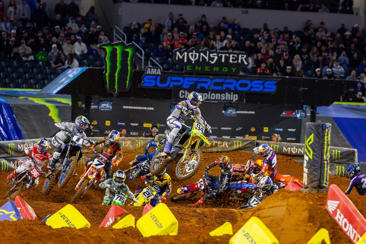 A aguardada abertura da Costa Leste foi igualmente eletrizante. Jo Shimoda (Honda HRC Progressive), em sua primeira corrida após cirurgia para reparar vértebras fraturadas, largou na frente. Pierce Brown (Monster Energy Yamaha Star Racing) e Daxton Bennick (Rockstar Energy Husqvarna) vinham logo atrás. Shimoda abriu vantagem, mas uma bandeira médica vermelha mudou o rumo da prova. Brown aproveitou o momento para assumir a liderança e resistiu até o fim, conquistando sua primeira vitória no Supercross após 33 largadas.