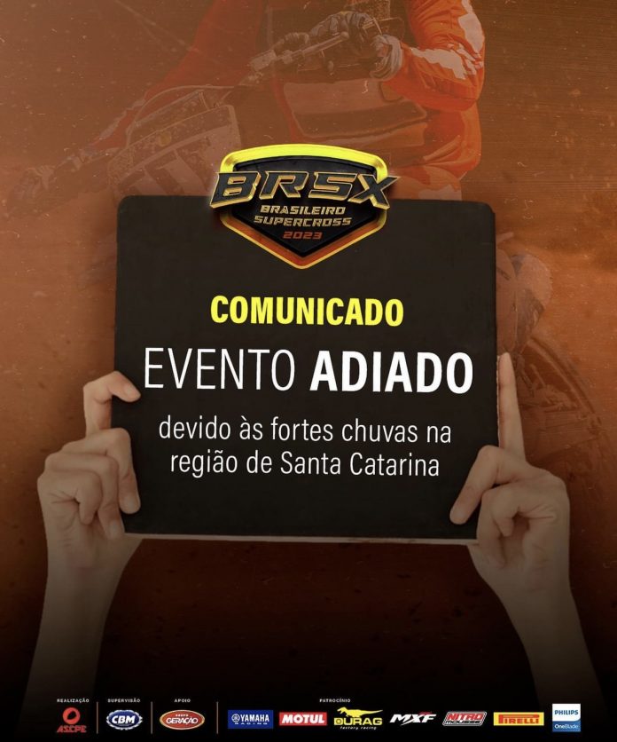 É com grande pesar que anunciamos o adiamento do Brasileiro de Supercross, que estava programado para acontecer nos dias 03, 04 e 05 de Novembro. Devido às fortes chuvas que castigaram a região nas últimas semanas, fazendo com que as cidades de SC e seus eventos fossem cancelados neste mês muito chuvoso, a pista e as condições de segurança tornaram-se impraticáveis para a realização do evento.