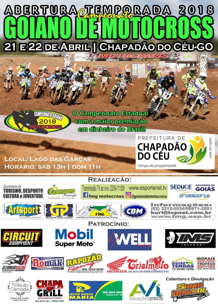 Chapadão do Céu recebe a abertura do Campeonato Estadual Goiano de Motocross 2018. A cidade que fundada em 21 de agosto de 1.982 e o município emancipado em 1991, está localizada no sudoeste do Estado de Goiás a 460 km de Goiânia, com uma população de 12.000 habitantes. A sua economia é baseada no agronegócio e no turismo. É considerado o portal de entrada do Parque Nacional das Emas.
