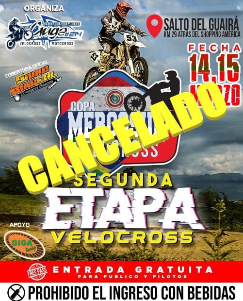 A 2ª etapa da Copa Mercosul de Velocross que aconteceria no próximo final de semana 14 e 15 de março, está cancelada. O motivo é o Coronovírus. Assim como na Argentina em relação ao Mundial de Motocross, o Ministério da Saúde do Paraguai, suspendeu pelos próximos 15 dias todo tipo de evento onde grande concentração de pessoas.