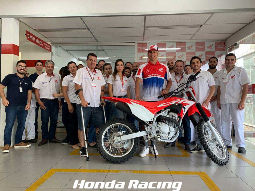 “Todo ano no fim da temporada eu vou pra casa dos meus pais em Piçarras SC para descansar e me divertir, porém minhas motos de competição e minha estrutura oficial ficam em Curitiba e não consigo levar nada para casa, para ao menos me divertir, já que mesmo de férias a mão coça para acelerar né?! Por esse motivo quando cheguei em casa fui no concessionário Honda da região e adquiri uma CRF 250F para deixar na minha casa, para que eu pudesse me divertir, dar meus cursos e ter uma moto super legal para sempre que a mão coçasse eu poder montar e ir curtir sem o compromisso dos treinos como é no Centro de Treinamento com a equipe!