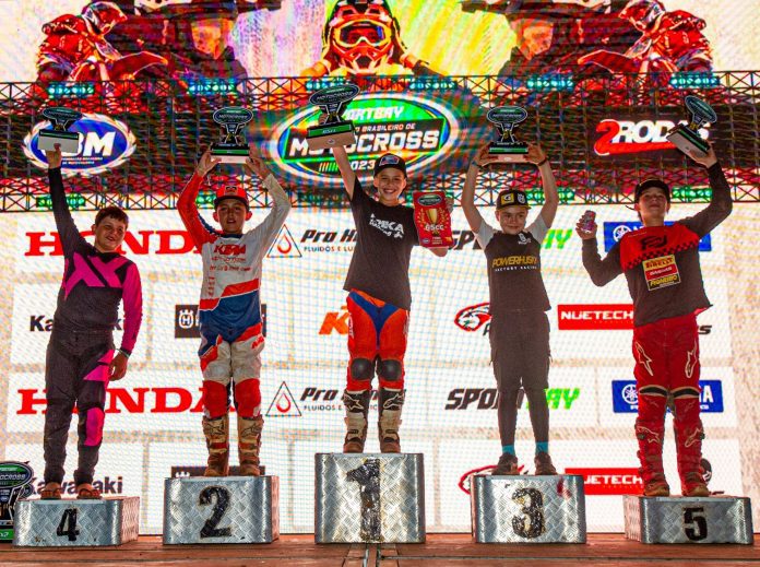 Heitor abriu o domingo na 1ª posição da 65cc no Warm Up (aquecimento). Largou em terceiro, caiu, voltou na 6ª posição até chegar a 2º. Tirou 8 segundos da diferença com o líder, quando caiu novamente na última volta e terminou em 3º. Se preparou bem na pré-temporada e subiu ao pódio. “Foi uma corrida legal. Cai na primeira volta mas consegui levantar a moto e voltar, daí fiz um bom ritmo de corrida para me recuperar. Busquei o 2º lugar, depois quando foi buscar o 1º cai. Agora é pensar na próxima etapa, em Ibirubá”, diz o paulistano de 10 anos, que em 2021 conquistou três títulos para Husqvarna (Campeão Brasileiro, Paulista e do Arena Cross na 50cc).
