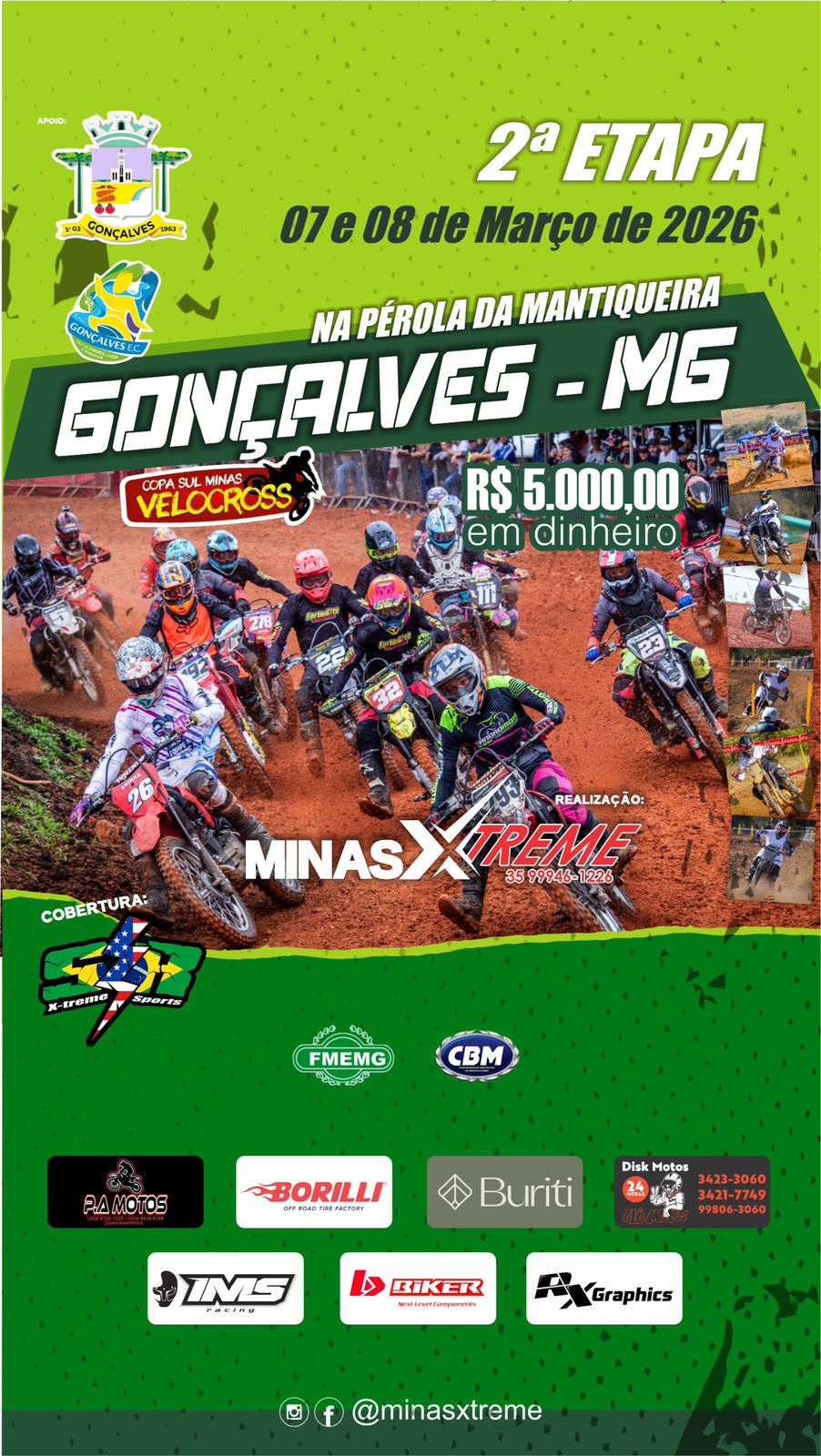 Após o grande sucesso da abertura em Extrema/MG, a Copa Sul Minas de Velocross segue rumo à Gonçalves onde realiza a segunda etapa da temporada nos dias 7 e 8 de março. Com diversas etapa de sucesso realizadas em Gonçalves nos últimos anos, as expectativas são altas para mais uma rodada. Vale lembrar que serão distribuídos R$5 mil de premiação para as categorias, portanto, garanta a sua vaga no gate e não fique de fora.