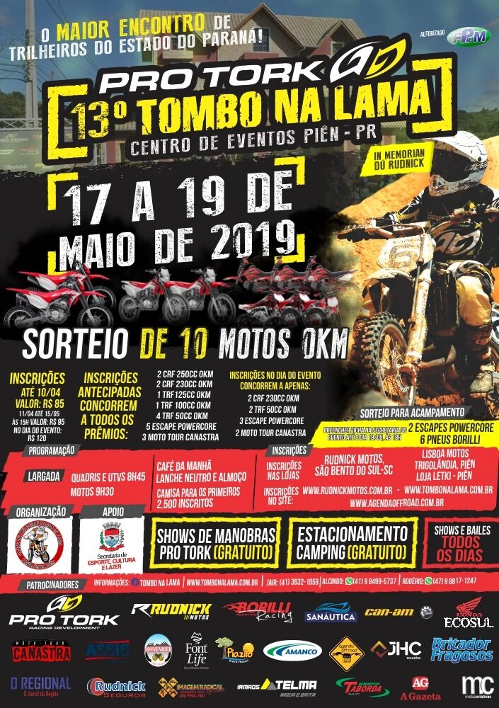 Estão abertas as inscrições para o maior encontro de trilheiros do Paraná e um dos melhores do Brasil. O 13º Pro Tork Tombo na Lama pretende reunir mais de 2,5 mil trilheiros com suas motocicletas, quadriciclos e UTVs, em um percurso de aproximadamente 60 quilômetros por belas paisagens da cidade de Piên, no domingo, 19 de maio.