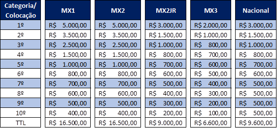 Os pilotos privados** com motocicletas Yamaha, ano/modelo igual ou superior a 2013 nas categorias: MX2; MX2Jr; MX3; Nacional, estão aptos a receberem uma premiação em dinheiro conforme sua classificação geral de cada etapa conforme tabela abaixo: