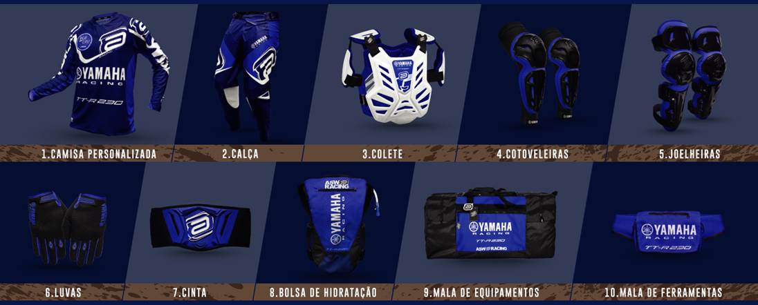 Ao comprar uma TT-R 230 0km, o participante ganhará um belo e completo kit off road da ASW, composto por colete de proteção, cotoveleiras, joelheiras, bolsa de ferramentas, bolsa de hidratação, uma ampla bolsa para guardar ou transportar todos estes equipamentos, calça e camisa, que por sua vez pode ser customizada com o nome e número desejado.