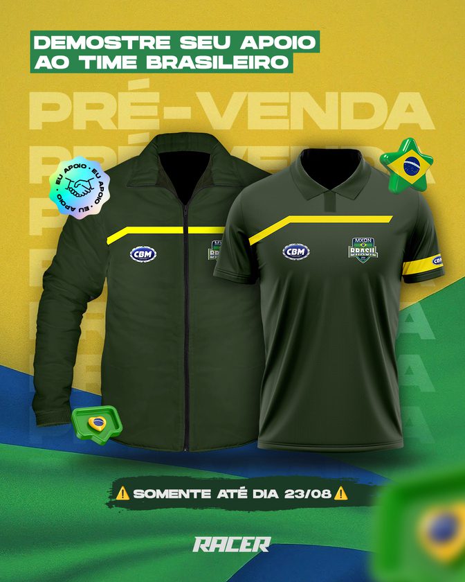 A Racer Off Road, empresa brasileira focada na produção e desenvolvimento de conjuntos para a pratica do off road e roupas casuais para pilotos e equipes, ambos personalizados, apresenta a pré-venda dos uniformes oficiais que serão utilizados pelo Time Brasil, formado por Fábio Santos, Enzo Lopes e Bernardo Tibúrcio, no Motocross das Nações, em outubro, na Inglaterra.