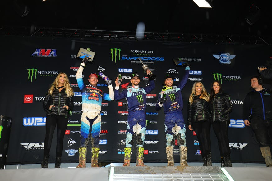 Pódio da categoria 250cc na abertura do AMA SX 2019. 1º Colt Nichols, 2º Dylan Ferrandis, 3º Shane Mcelrath!