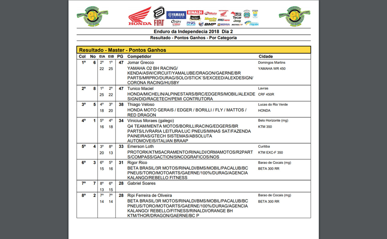Depois de vencer o primeiro dia do Enduro da Independência no critério de desempate, o piloto Jomar Grecco, da Equipe Yamaha O2BH América Racing, repetiu a cena hoje e venceu novamente o segundo dia de competição da mesma forma, empatado com Tunico Maciel da equipe Honda Racing Brasil. Nesta etapa os pilotos deixaram a cidade de Lavras com destino a Lambari, passando por São Tomé das Letras, região conhecida pelo alto nível das trilhas, percorrendo 183 km.