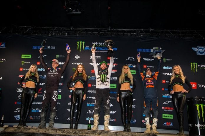 Na 450cc, Eli Tomac superou Ken Roczen por duas vezes e levou a vitória, na última volta Roczen que era o segundo ainda foi ultrapassado pelo Cooper Webb e assim ficou o pódio da etapa na categoria das brutas!