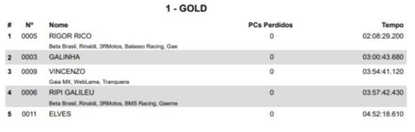 Com a técnica em dia e o preparo físico perto do ideal, já que vem de uma grave lesão no pé, Rígor largou na frente, abriu uma boa vantagem e fechou o dia sendo campeão. Ripi Galileu, que largou logo atrás do companheiro de equipe Beta, teve alguns problemas, incluindo um ataque de abelhas, e fechou o dia em quarto lugar. Outros nomes rechearam o pódio, como o “Galinha” que ficou em segundo, 52 minutos atrás do líder, Vicenzo Barbagallo em P3 e Elves P5.