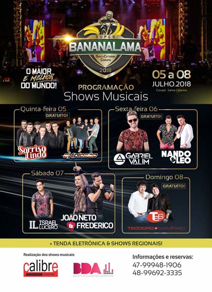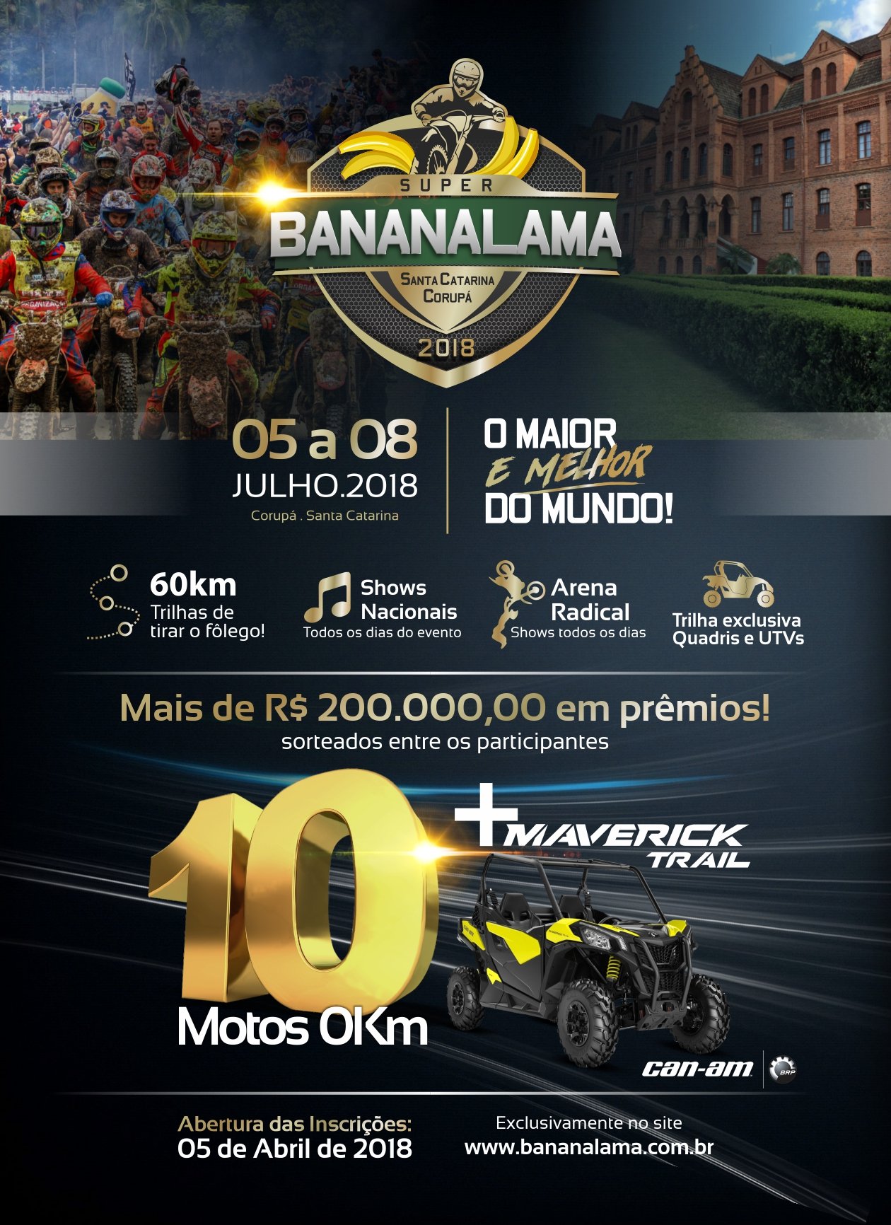 “Maior e melhor encontro de trilheiros do mundo”, o Bananalama começou em 2004. Realizado pelo Clube de Trilheiros Bananalama de Corupá (SC), cidade a 210 quilômetros de Florianópolis, capital brasileira da banana, o evento está na 12ª edição e reúne milhares de apaixonados pelo off-road de todo o Brasil e também da América do Sul. São quatro dias repletos de atrações como sorteio de 10 motos Honda CRF 230F 0km e um 1 UTV Can-Am Maverick Trail, supertrilha, apresentações de manobras radicais, shows musicais, arena de exposições e muito mais. Em 2010 e 2013, o Bananalama entrou para o livro dos recordes como o maior encontro de trilheiros do mundo. Mais de 4 mil participantes de motos, além de centenas de quadriciclos e UTVs garantiram este feito. O objetivo do encontro é manter vivo o espírito esportivo, com responsabilidade ambiental e social, além de divulgar e movimentar o turismo do município de Corupá e do Estado de Santa Catarina.