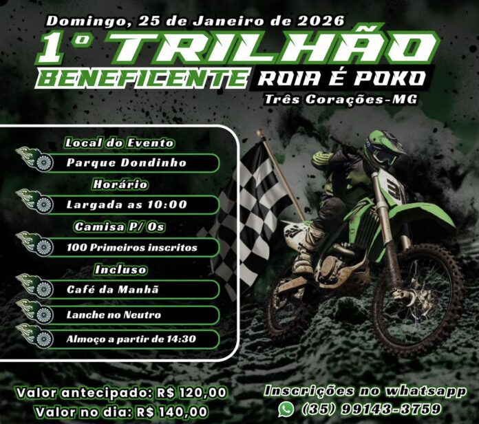 Três Corações/MG se prepara para receber um grande evento solidário: a Trilha Beneficente “Roia é Poko”, marcada para o dia 25 de janeiro de 2026, com largada no Parque Dondinho, às 10h da manhã.