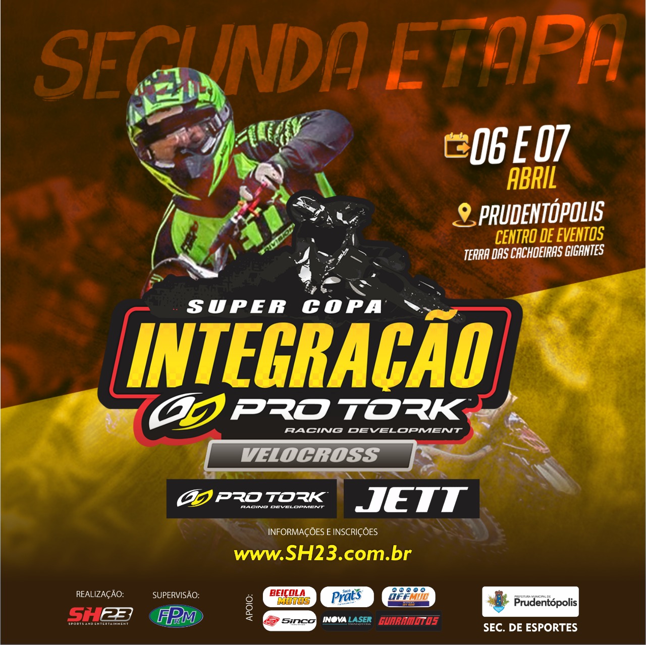 A Super Copa Pro Tork Integração de Velocross terá sua segunda etapa realizada neste fim de semana, 6 e 7 de abril, na cidade de Prudentópolis. Mais de 200 pilotos são aguardados para as disputas, que prometem fazer o público vibrar no Centro de Eventos Terra das Cachoeiras Gigantes. O ingresso custa R$ 10, sendo válido para ambos os dias, e deve ser adquirido no local.