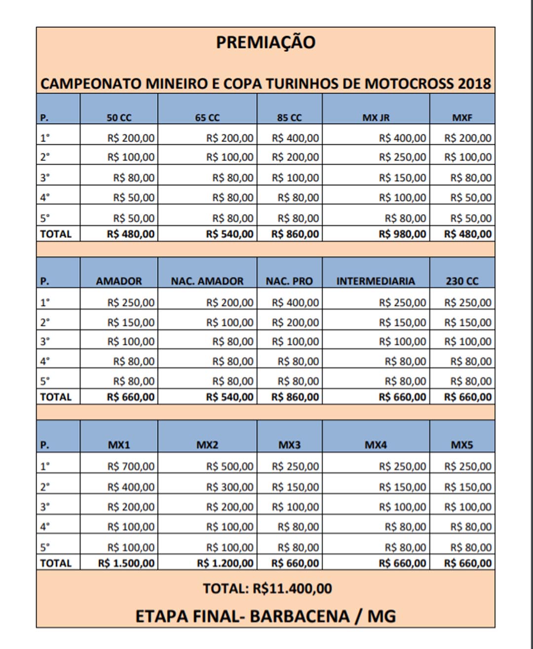 É com muito prazer que divulgamos que estaremos na Cobertura Completa e Oficial da grande Final do Campeonato Mineiro de Motocross 2018, no CT da Turinhos Motos em Barbacena-MG uma das mais tradicionais pistas de MG, com estrutura completa, mais de 10 mil reais em premiação, inscrições a primeira paga inteira (R$165.00) a partir da 2ª só paga meia (R$ 82.50) e os pilotos poderão correr nas categorias que quiserem desde que seja acima do nível da sua!