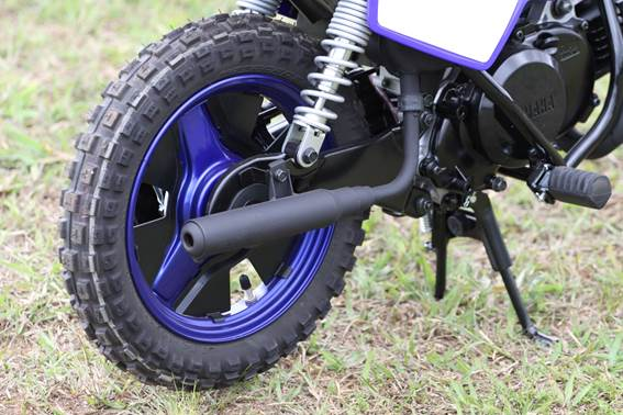 A ponteira de escapamento é outro exemplo de como os engenheiros da Yamaha buscaram melhorar a segurança e o conforto na PW50. Ela conta com proteção contra o calor, e seu posicionamento visa ficar mais resguardado, impedindo queimaduras.